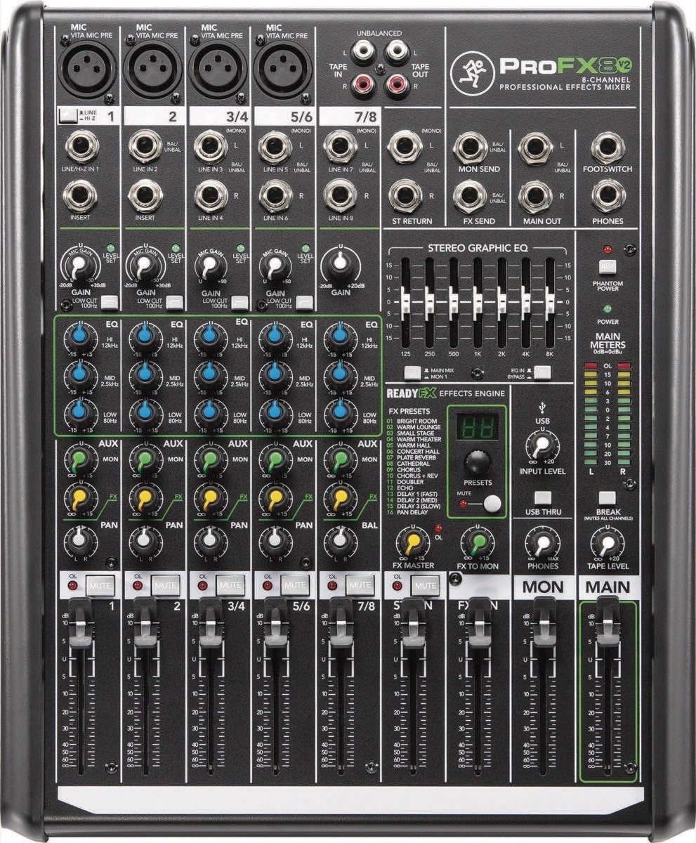 O mais recente desenvolvimento das mixers de formato pequeno da Mackie, a série ProFX v2 soa melhor do que nunca e fornece recursos convenientes a cada botão, fader, entrada e saída. Este é o ProFX8v2. Possui 4 pré-amplificadores de microfone Mackie Vita extremamente silenciosos, projetados para dar vida a qualquer entrada, bem como o novo mecanismo de efeitos ReadyFX, com 16 efeitos de ótima sonoridade, incluindo reverbs, atrasos e refrões.